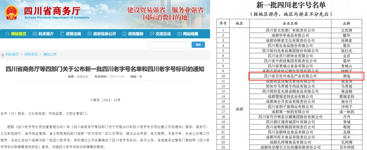 2024年,四川省商務(wù)廳、文化和旅游廳、市場監(jiān)管局、文物局聯(lián)合開展的年度"四川老字號"評選中,四川省百世興食品產(chǎn)業(yè)有限公司及其品牌"酒鬼"花生登榜!這標志著傳承四代的"酒鬼"花生以獨特的歷史文化和非遺傳承技藝正式獲得官方認證的歷史文化品牌殊榮。
